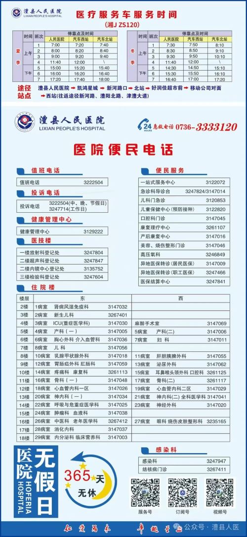 说明:关于澧县人民医院各科室业务便民电话汇总表的信息作出特别说明:本信息立足为社会大众提供有价值的参考资料和办事指南等公共信息,部分图文来源于网络或者有关机构公开内容,属于公益性的分享与传播。虽然尽力确保内容的准确性和实效性,但由于各种因素,难免存在疏忽和差错,敬请不吝赐教,欢迎相互交流,共同学习。对信息中陈述、观点判断保持中立,版权属原作者所有,如涉侵权或者差错等问题,请联系网络信息推广平台秋果黄页网客服(187/8199/3958微信同号),一定会及时删除或者修正。谢谢!