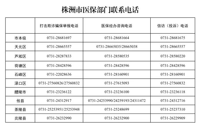 株洲市市本级和各区(市)县医保部门联系电话信息表如下:株洲市各级医保部门打击医保基金欺诈骗保举报电话。株洲市各级医保经办咨询电话。株洲市各级医保部门投诉电话。