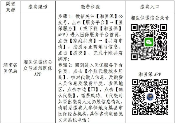 如果您是首次办理城乡居民医保,应通过“湘医保”微信公众号、医保经办机构、乡镇(街道)政务服务中心和村(社区)政务服务站进行参保登记。相关业务办理可咨询参保地税务或医保部门,热线电话如下: