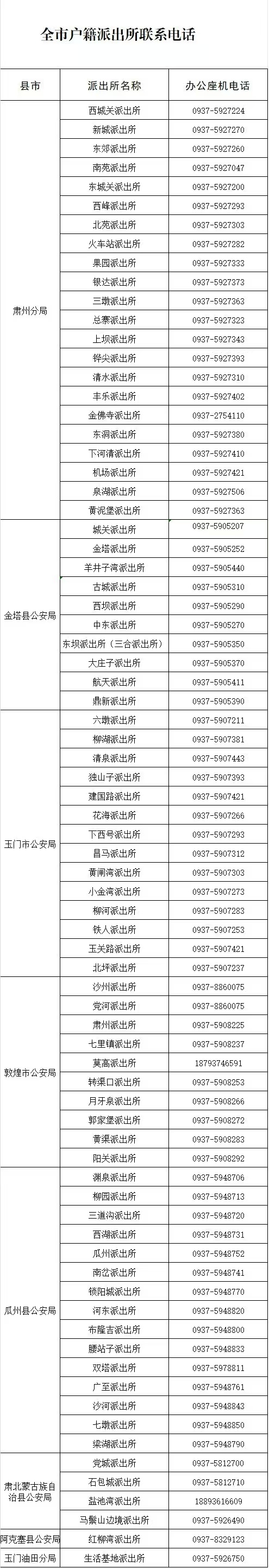 酒泉市各级户政机关咨询电话: