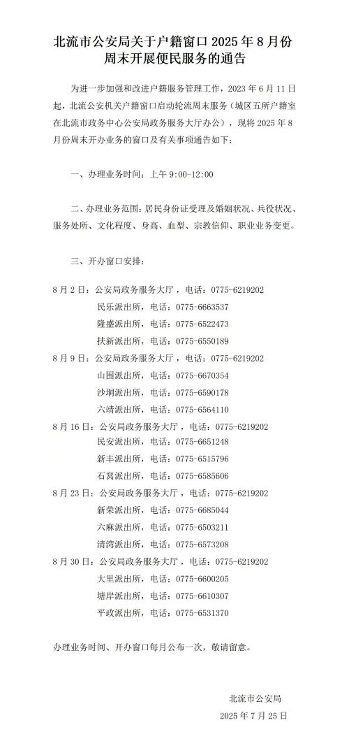 北流市户籍窗口(政务中心和派出所户籍)便民服务信息如下: