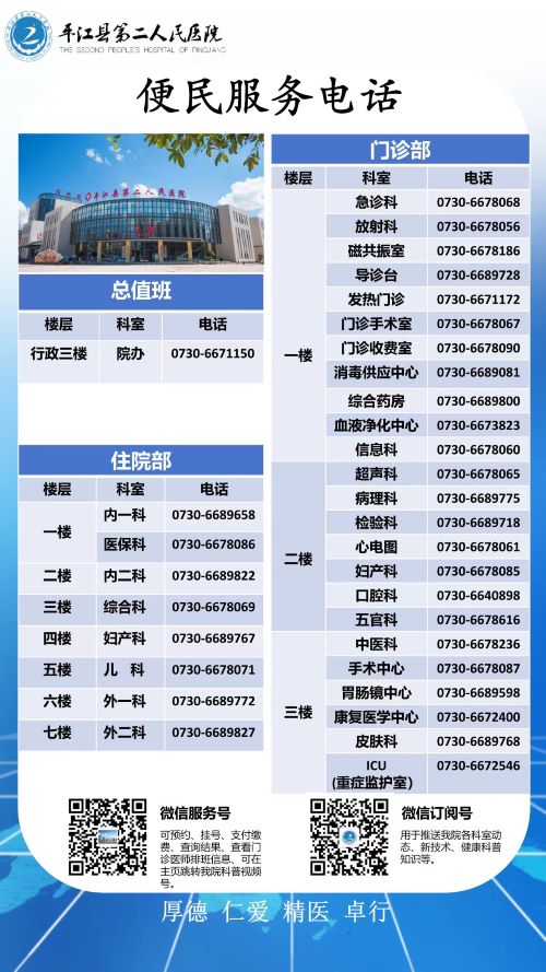 平江县第二人民医院各科室医疗便民服务电话信息表如下: