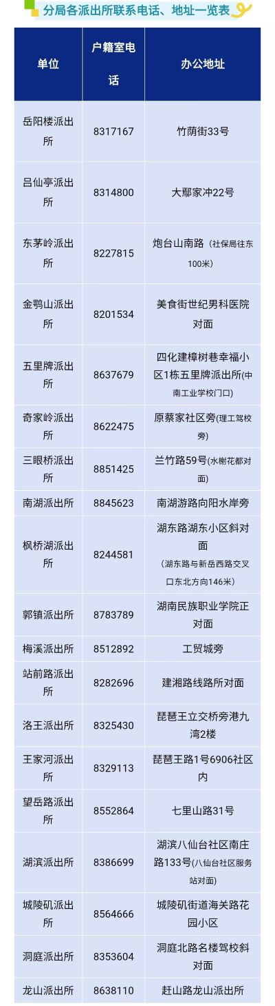 岳阳市岳阳楼区各派出所户籍室对外联系电话信息表如下: