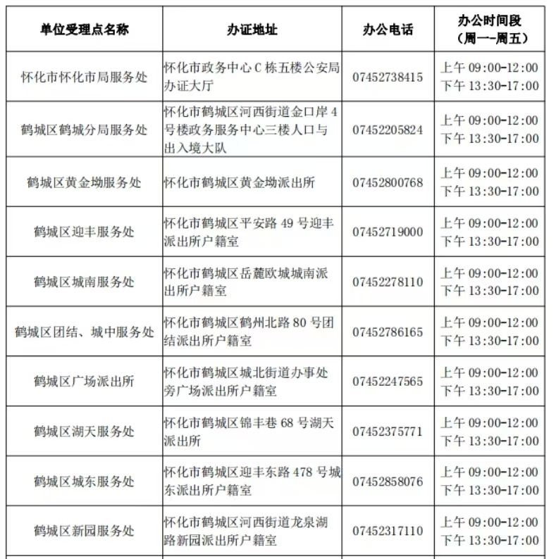 怀化市鹤城区政务中心和派出所受理身份证办证服务窗口电话信息表:统筹居民身份证服务处,确保各受理点正常办证,建议广大群众选择以下受理点就近办理居民身份证申领、补领、换领业务。跨县、跨市州、跨省办理身份证的居民需到县级以上服务点办理。