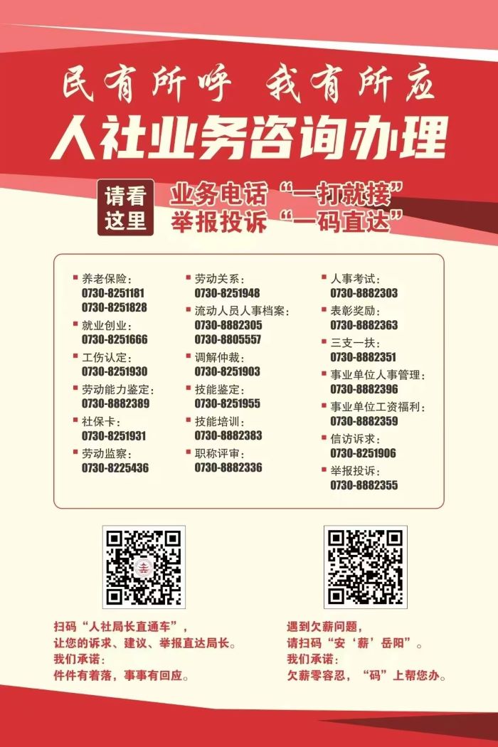 为进一步提高岳阳市人社局公共政务服务水平,方便企业和群众咨询了解相关政策信息、办理相关业务,现将岳阳市人力资源和社会保障局政务服务业务咨询电话更新汇总如下。【上班时间为周一至周五,上午9:00—12:00、下午1:30—5:30(夏令时为下午2:00—6:00)】