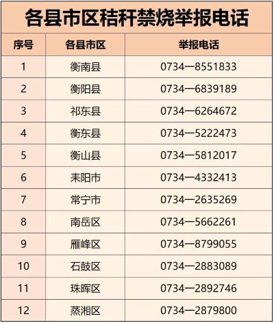 说明:关于衡阳市全市各县(市)区农作物秸秆露天禁烧举报电话的信息仅供参考。