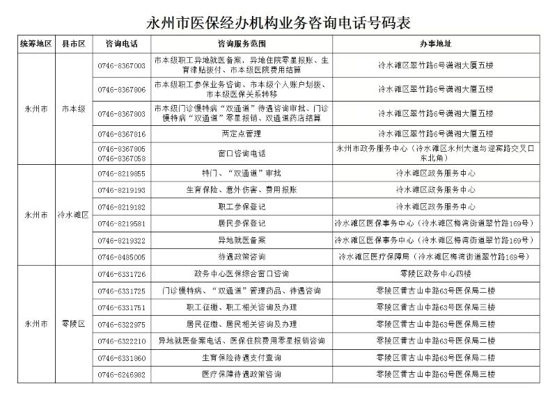 永州市市本级医保经办机构业务咨询电话和办事地址、永州市冷水滩区医保经办机构业务咨询电话和办事地址、永州市零陵区医保经办机构业务咨询电话和办事地址。