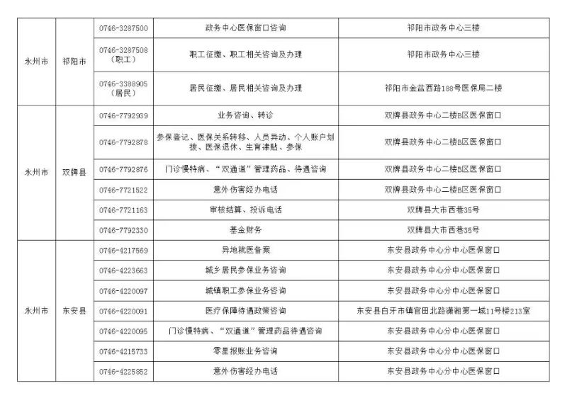 永州祁阳市医保经办机构业务咨询电话和办事地址、永州市双牌县医保经办机构业务咨询电话和办事地址、永州市东安县医保经办机构业务咨询电话和办事地址。