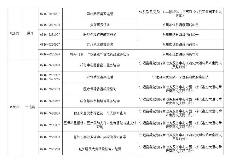 永州市道县医保经办机构业务咨询电话和办事地址、永州市宁远县医保经办机构业务咨询电话和办事地址。