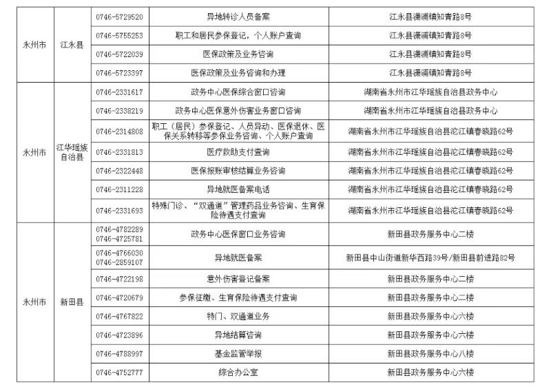 永州市江永县医保经办机构业务咨询电话和办事地址、永州市江华县医保经办机构业务咨询电话和办事地址、永州市新田县医保经办机构业务咨询电话和办事地址。