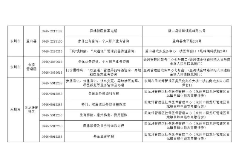 永州市蓝山县医保经办机构业务咨询电话和办事地址、永州市金洞管理区医保经办机构业务咨询电话和办事地址、永州市回龙圩管理区医保经办机构业务咨询电话和办事地址。