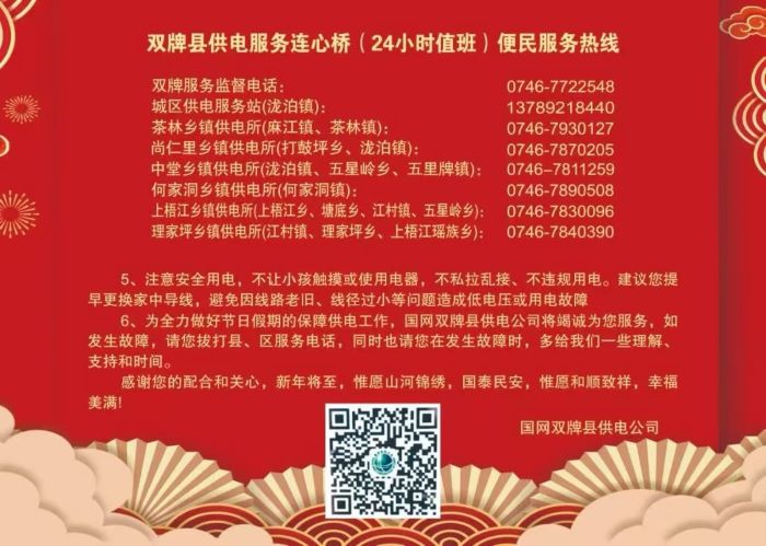 双牌县供电公司供电服务连心桥(24小时值班)便民服务热线: