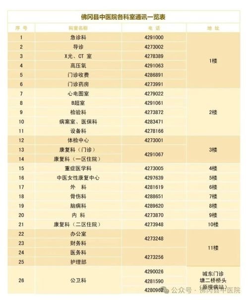 说明:关于佛冈县中医医院各业务科室通讯一览表的信息作出特别说明:本信息立足为社会大众提供有价值的参考资料和办事指南等公共信息,部分图文来源于网络或者有关机构公开内容,属于公益性的分享与传播。虽然尽力确保内容的准确性和实效性,但由于各种因素,难免存在疏忽和差错,敬请不吝赐教,欢迎相互交流,共同学习。对信息中陈述、观点判断保持中立,版权属原作者所有,如涉侵权或者差错等问题,请联系网络信息推广平台秋果黄页网客服(187/8199/3958微信同号),一定会及时删除或者修正。谢谢!