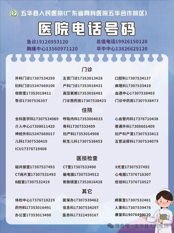 五华县人民医院门诊、住院及医技检查科室电话号码大全: