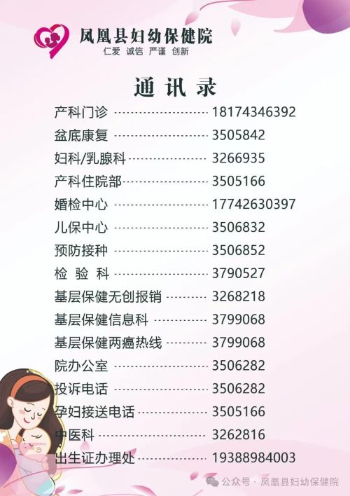 说明:关于凤凰县妇幼保健院各科室通讯录的信息作出特别说明:本信息立足为社会大众提供有价值的参考资料和办事指南等公共信息,部分图文来源于网络或者有关机构公开内容,属于公益性的分享与传播。虽然尽力确保内容的准确性和实效性,但由于各种因素,难免存在疏忽和差错,敬请不吝赐教,欢迎相互交流,共同学习。对信息中陈述、观点判断保持中立,版权属原作者所有,如涉侵权或者差错等问题,请联系网络信息推广平台秋果黄页网客服(187/8199/3958微信同号),一定会及时删除或者修正。谢谢!