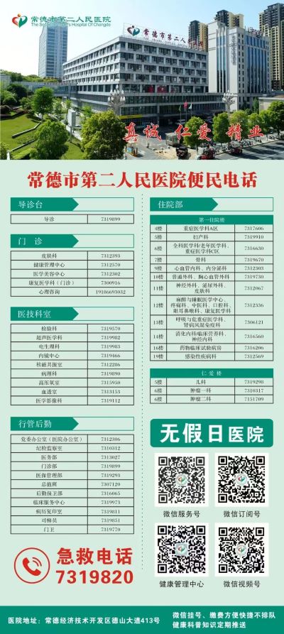 提示:关于常德市第二人民医院医疗业务便民电话大全的信息作出特别说明:本信息立足为社会大众提供有价值的参考资料和办事指南等公共信息,部分图文来源于网络或者有关机构公开内容,属于公益性的分享与传播。虽然尽力确保内容的准确性和实效性,但由于各种因素,难免存在疏忽和差错,敬请不吝赐教,欢迎相互交流,共同学习。对信息中陈述、观点判断保持中立,版权属原作者所有,如涉侵权或者差错等问题,请联系网络信息推广平台秋果黄页网客服(187/8199/3958微信同号),一定会及时删除或者修正。谢谢!