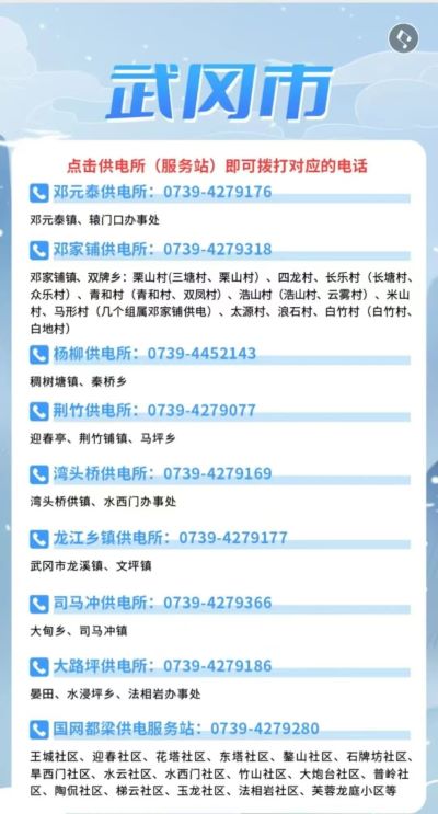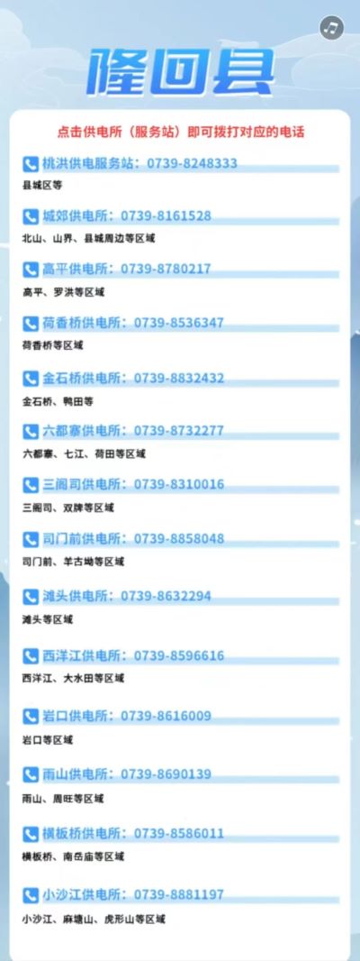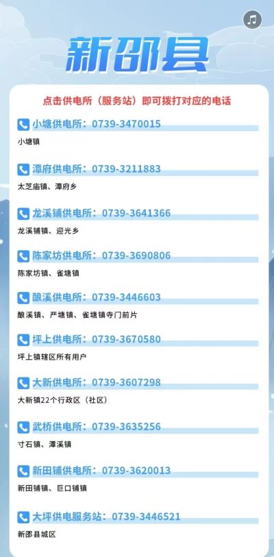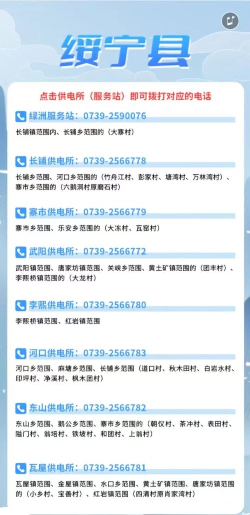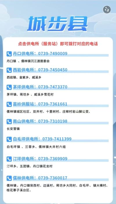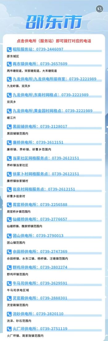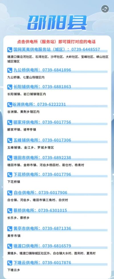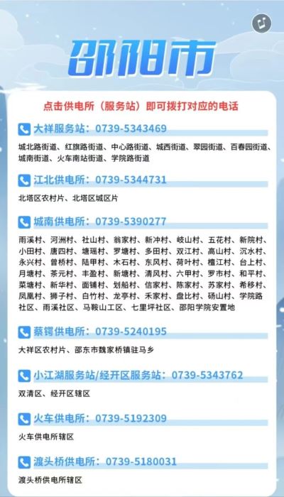 说明:关于邵阳各市区县供电公司各供电所电力抢修服务电话的信息作出特别说明:本信息立足为社会大众提供有价值的参考资料和办事指南等公共信息,部分图文来源于网络或者有关机构公开内容,属于公益性的分享与传播。虽然尽力确保内容的准确性和实效性,但由于各种因素,难免存在疏忽和差错,敬请不吝赐教,欢迎相互交流,共同学习。对信息中陈述、观点判断保持中立,版权属原作者所有,如涉侵权或者差错等问题,请联系网络信息推广平台秋果黄页网客服(187/8199/3958微信同号),一定会及时删除或者修正。谢谢!