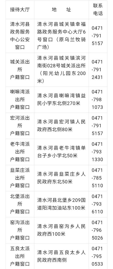 清水河县政务服务中心窗口及各派出所户籍窗口业务办理地址和联系方式:为进一步优化政务服务质效,切实便利群众高效办理户籍类业务及各类支持“网上办”的审批事项。清水河县现将政务服务中心窗口及各派出所的联系电话、地址予以公示。具体信息如下: