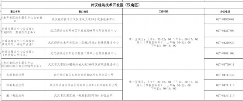 武汉经济技术开发区政务中心和派出所户籍(身份证)业务电话: