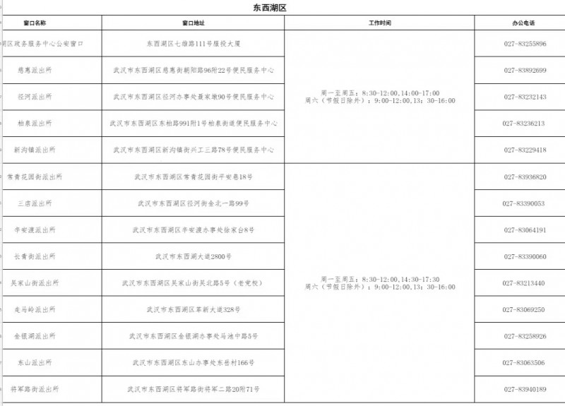 武汉市东西湖区政务中心和各派出所户籍(身份证)业务电话: