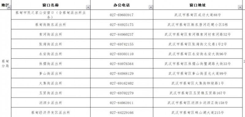 武汉市蔡甸区各派出所户籍窗口办理身份证业务办公电话信息表如下: