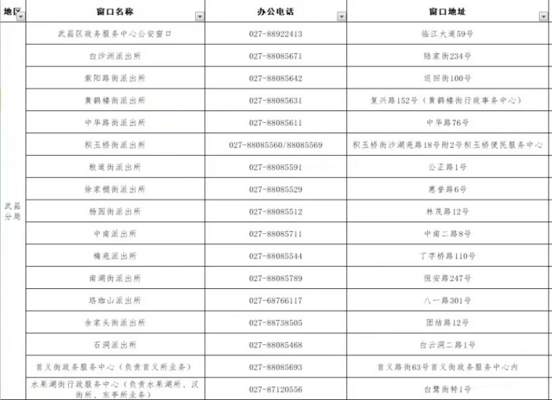 武汉市武昌区政务中心和派出所户籍身份证办理地址和办公电话: