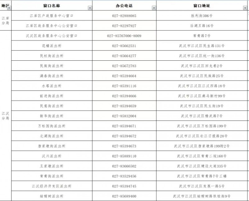 武汉市江汉区户政中心、政务中心和派出所户籍身份证办理窗口信息表如下:
