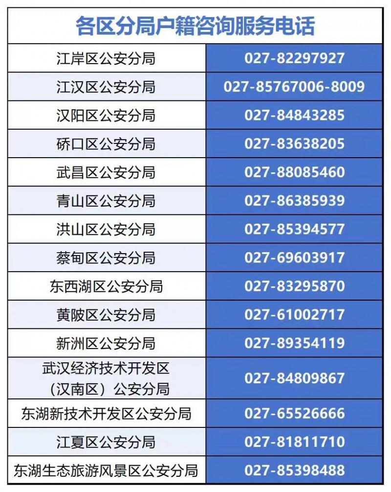 武汉市全市辖区各区主管部门户籍业务咨询电话如下: