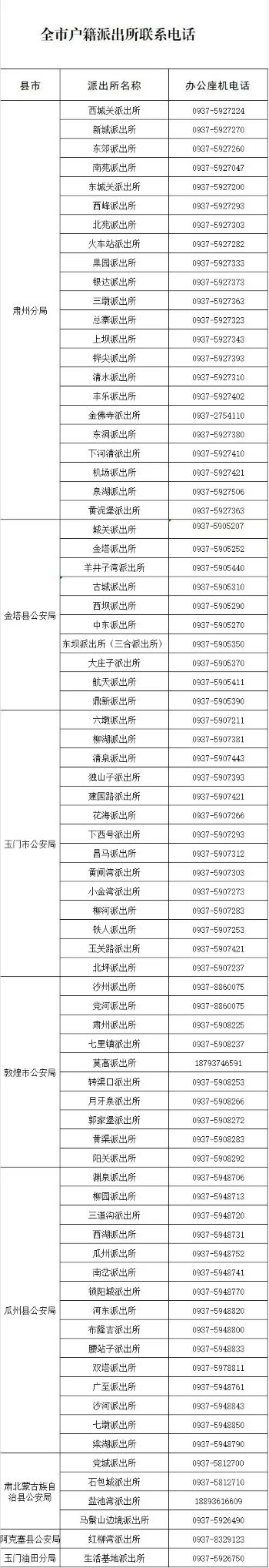 甘肃酒泉市全市各区(市)县辖区各户籍派出所联系电话大全表如下: