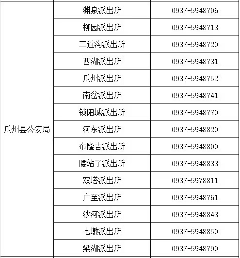 甘肃酒泉市瓜州县辖区各户籍派出所联系电话信息表如下: