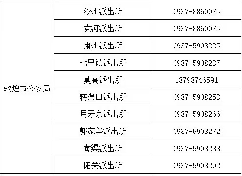 说明:关于酒泉敦煌市辖区各户籍派出所联系电话信息作出免责声明:关于此信息作出免责声明,此信息图文仅供参考,小编不承担任何法律责任。此信息来源于有关机构的公开内容,在此经过整理并转载,唯一的目的是通过互联网传播便民惠民信息。由于时间等原因,难免使信息发生变更,此信息如有侵权,或者差错,请联系删除,直接联系便民信息平台秋果黄页网客服电话(187-8199-3958微信同号),一定会及时删除和修正。