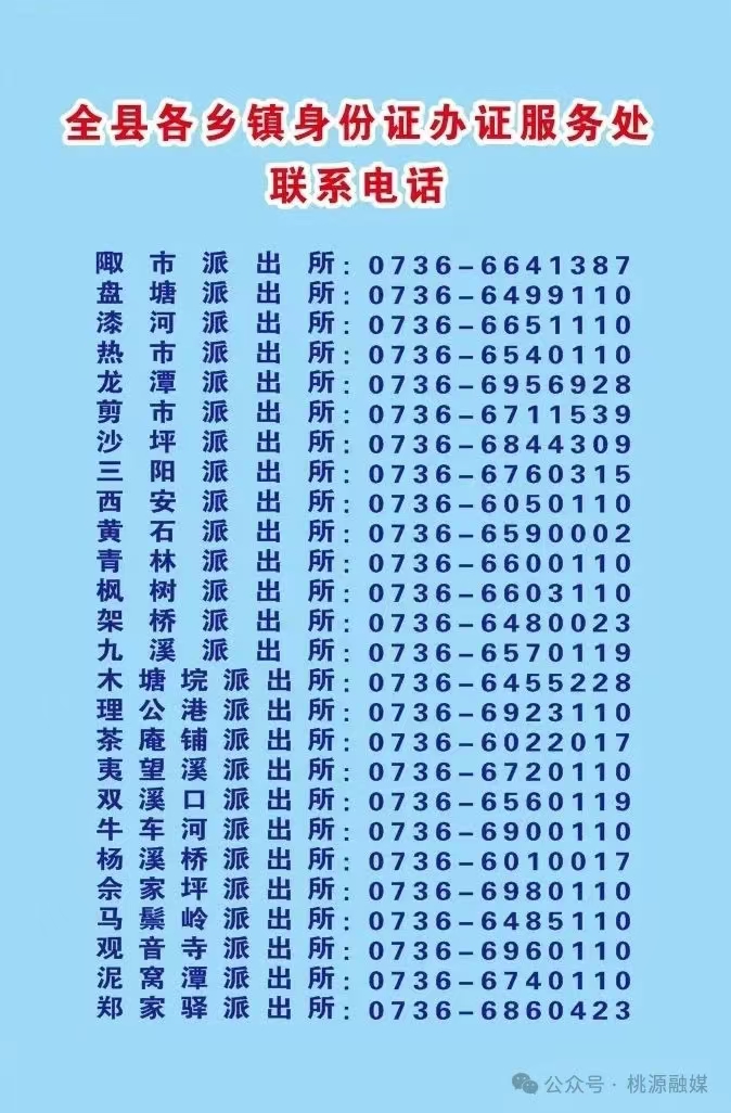 说明:关于桃源县全县各乡镇派出所身份证办证服务联系电话信息作出免责声明:关于此信息作出免责声明,此信息图文仅供参考,小编不承担任何法律责任。此信息来源于有关机构的公开内容,在此经过整理并转载,唯一的目的是通过互联网传播便民惠民信息。由于时间等原因,难免使信息发生变更,此信息如有侵权,或者差错,请联系删除,直接联系便民信息平台秋果黄页网客服电话(187-8199-3958微信同号),一定会及时删除和修正。