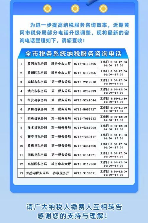 说明:关于黄冈市全市税务局(系统)纳税服务咨询电话信息仅供参考。