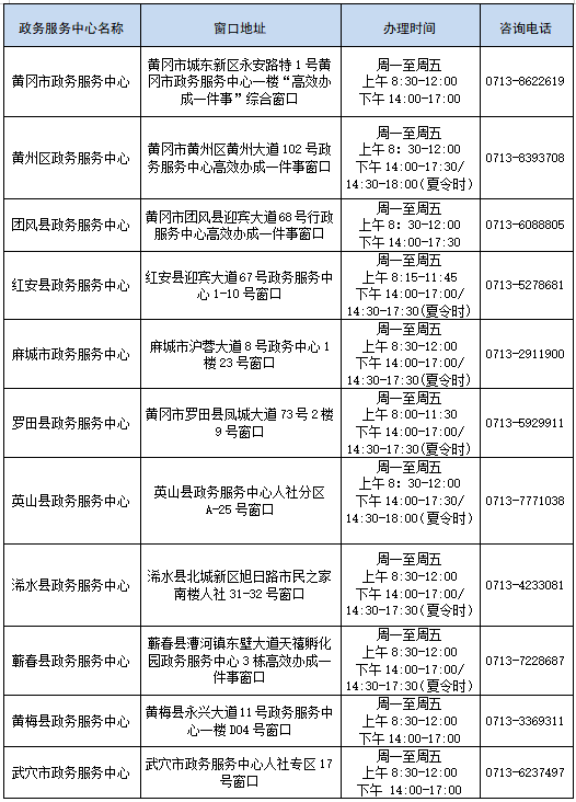 黄冈市全市“大学生就业落户安居一件事”办理窗口信息表如下: