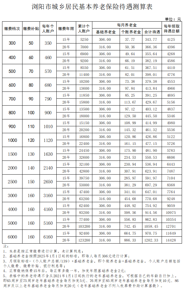 答:城乡居民养老保险待遇坚持长缴多得、多缴多得的原则,由基础养老金和个人账户养老金构成,支付终身。(1)基础养老金。①全市实行统一的基础养老金标准,2025年1月起为306元/月。②缴费年限累计超过15年的,每增加1年,加发年限基础养老金2元/月(不含补缴年限)。③对65周岁及以上参保城乡老年居民加发老年基础养老金,标准为年满65周岁不满76周岁加发5元/月;年满76周岁不满86周岁加发10元/月;86周岁以上加发20元/月。参保人员从符合条件的次月起享受加发的老年基础养老金待遇。(2)个人账户养老金。个人账户养老金月计发标准为个人账户全部存储额除以139,发放终身。(3)根据2025年1月1日的标准,从300元至6000元缴费档次,达到退休条件后,浏阳市城乡居民预估能享受的养老保险待遇情况见下表: