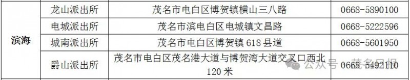 茂名滨海分局各派出所户政窗口地址电话信息一览表