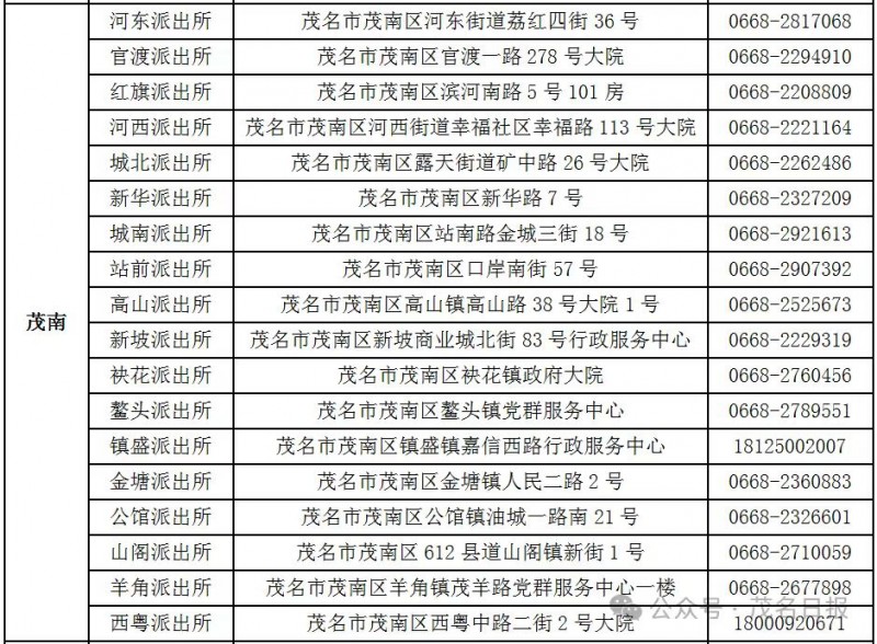 茂名市茂南区各辖区派出所户政窗口地址电话信息一览表