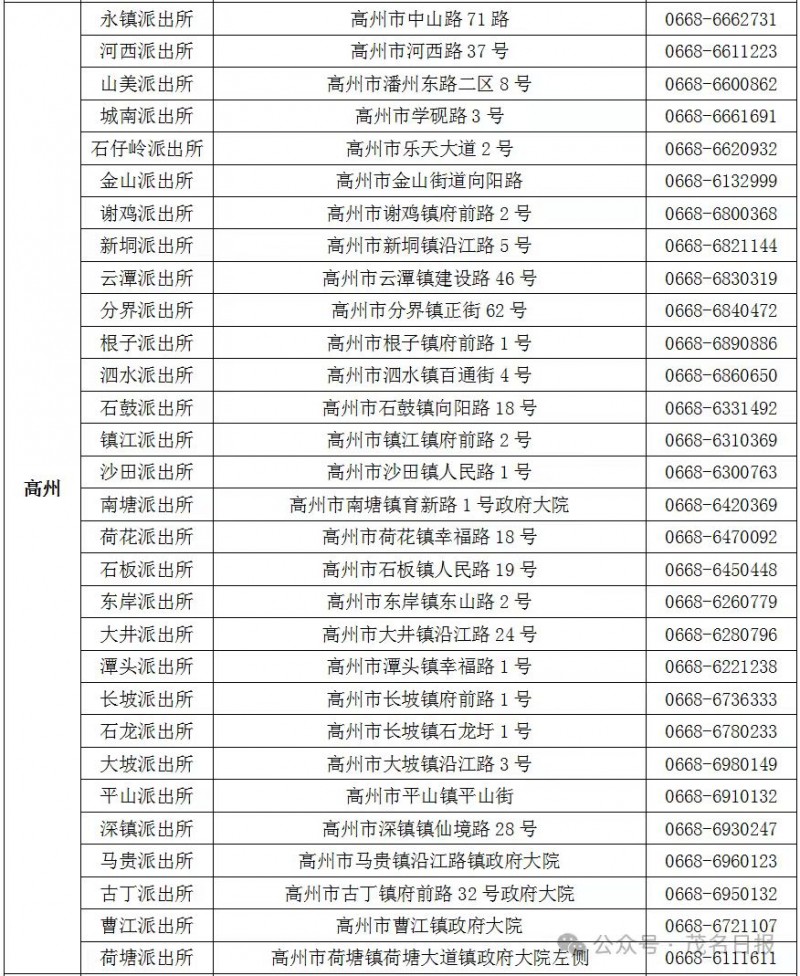 茂名高州市各辖区派出所户政窗口地址电话信息一览表