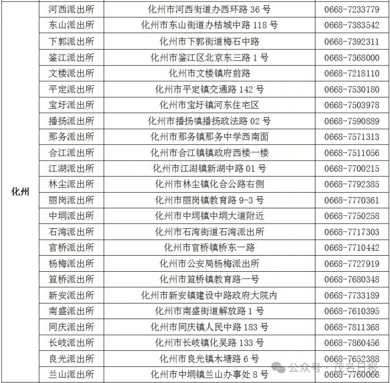 茂名化州市各辖区派出所户政窗口地址电话信息一览表