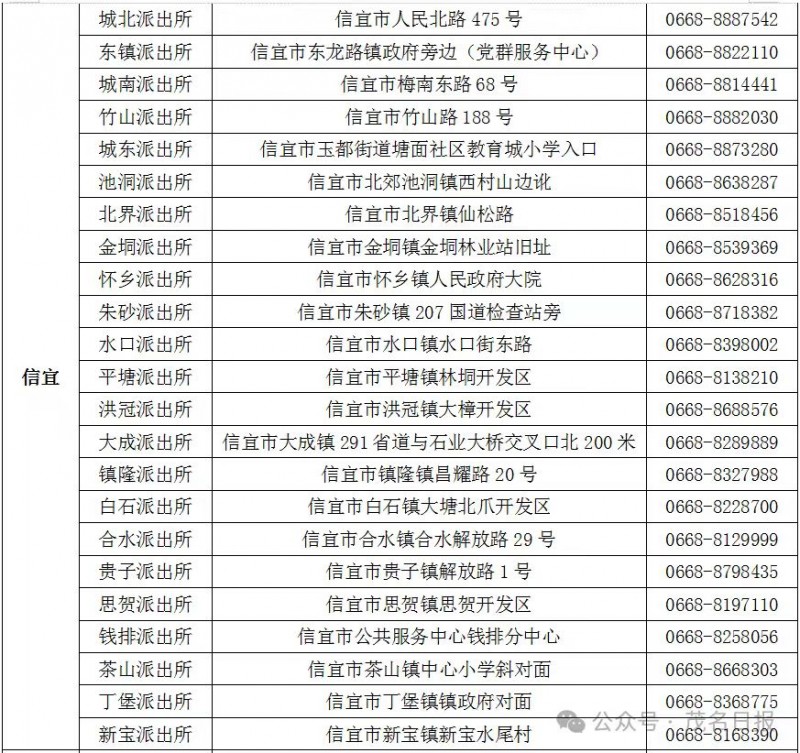 茂名信宜市各辖区派出所户政窗口地址电话信息一览表