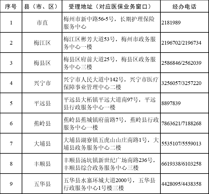 梅州市全市长期护理保险医保经办机构服务窗口地址和经办电话: