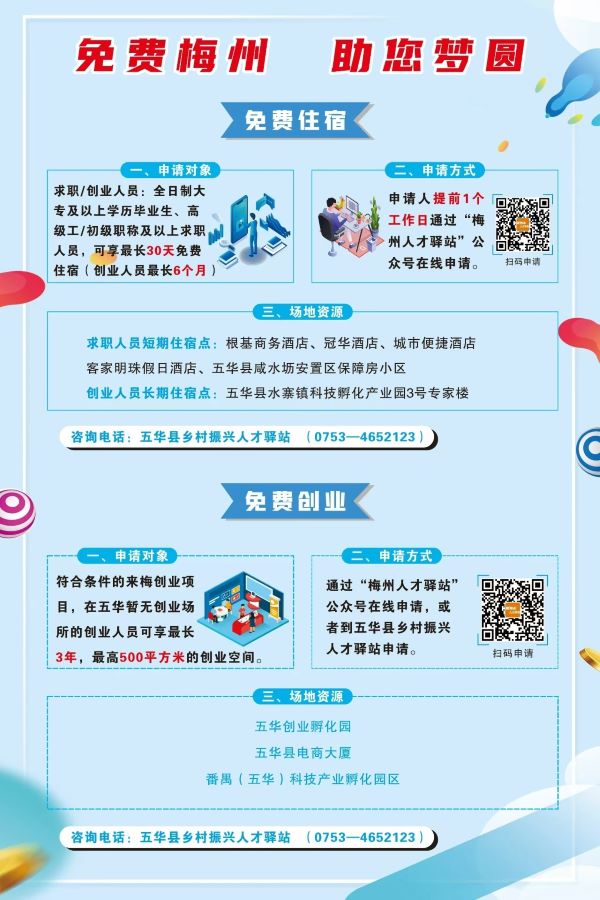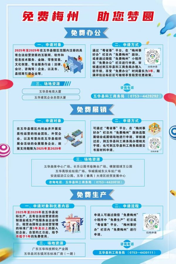 五华县“免费梅州” 政策矩阵赋能创业就业新征程:为激活人才活力、厚植创业沃土,五华县重磅推出涵盖免费住宿、免费创业、免费办公、免费展销、免费生产五大维度的政策组合拳,以一站式、全方位的支持,为逐梦者护航、为创业者赋能!