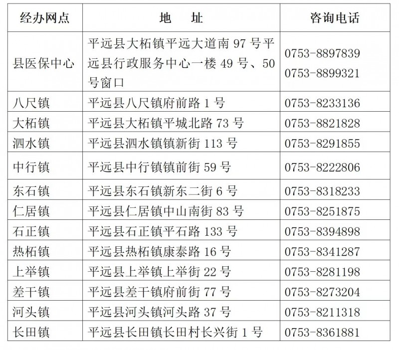 平远县城乡居民医保全县医保经办网点地址和咨询电话