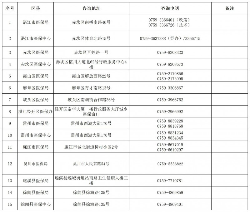湛江市全市城乡居民医保参保缴费咨询地址和咨询电话信息表如下: