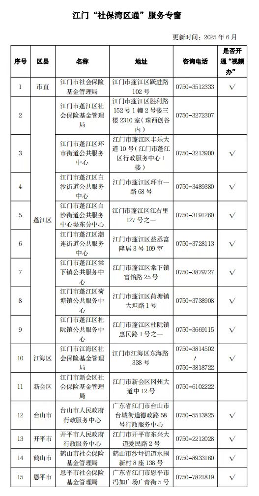 江门市湾区社保通服务专窗,为港澳居民提供社保专属服务。江门市全市各级“社保湾区通”服务专窗地址和咨询电话信息表如下: