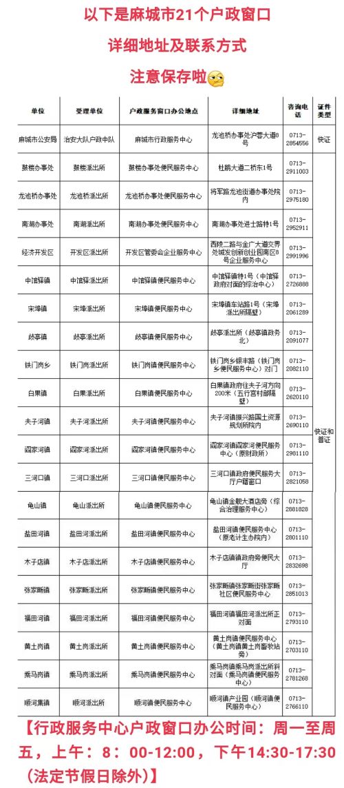 以下是麻城市户政中队和派出所21个户政窗口详细地址及联系电话信息表: