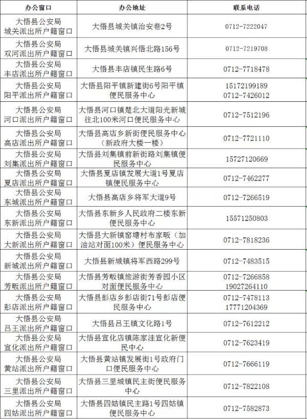 大悟县全县各辖区派出所户籍窗口办公地址和联系电话信息表如下: