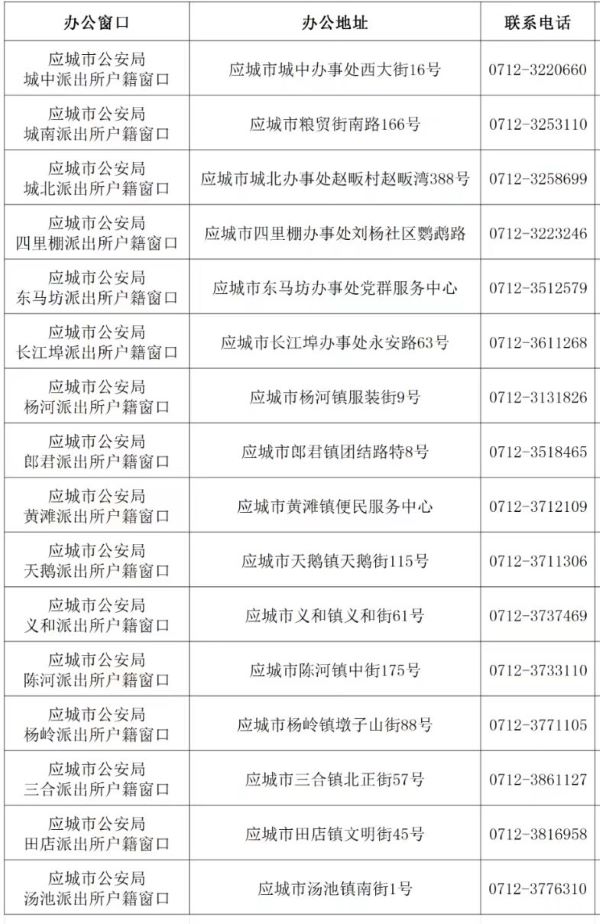 应城市辖区内各派出所户籍窗口办公地址和联系电话信息表如下: