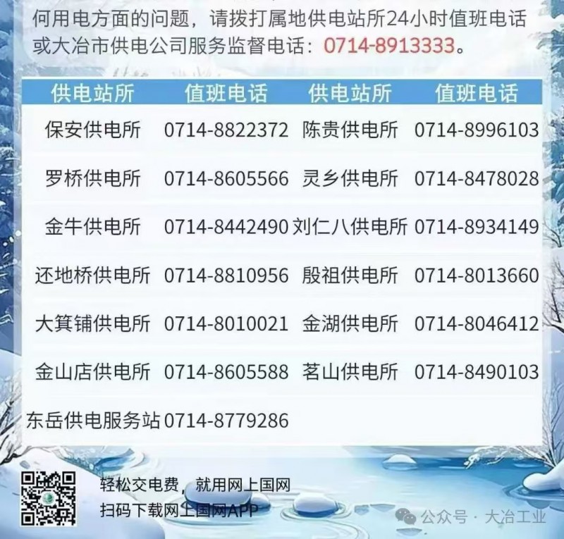 大冶市供电公司强运维、保供电、优服务,全天24小时与您相伴,绝不打烊,竭诚为您服务。如果您有任何有关用电方面的需求请拨打我们的属地供电站所24小时值班电话,我们已按照各供电区域将详细的供电服务电话整理如下,请您查收。