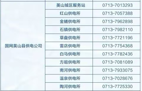 黄冈市英山县供电公司强运维、保供电、优服务,全天24小时与您相伴,绝不打烊,竭诚为您服务。如果您有任何有关用电方面的需求请拨打我们的属地供电站所24小时值班电话,我们已按照各供电区域将详细的供电服务电话整理如下,请您查收。